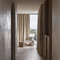 As one transcends through each space, they surpass lightly textured materials and gentle, curved forms. Venetian plaster is a handmade, beautifully crafted feature that is seen throughout and is complemented by travertine. Aged bronze expresses material in its rawest form. The result is an environment that feels like an undisturbed abode in a utopic realm – the design is weightless, light and airy.