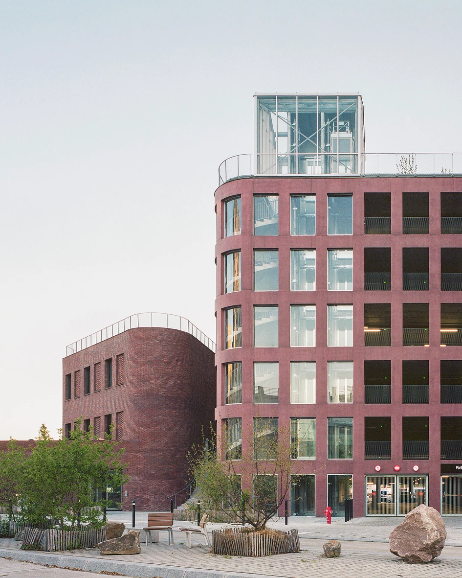 In the French city of Nantes, RAUM has designed Block 5B in a newly regenerated area of the city adjacent to a major rail line. The block contains a mid-rise workshop and offices, and a high-rise tower with a multi-storey car park sandwiched between them. The parking garage features a red-dyed concrete façade, while the two other structures are covered with red brick, creating a subtle interplay of textures and colours. The smaller block includes a solid brick facade and brick screens, while the tower features a more lightweight rainscreen cladding.