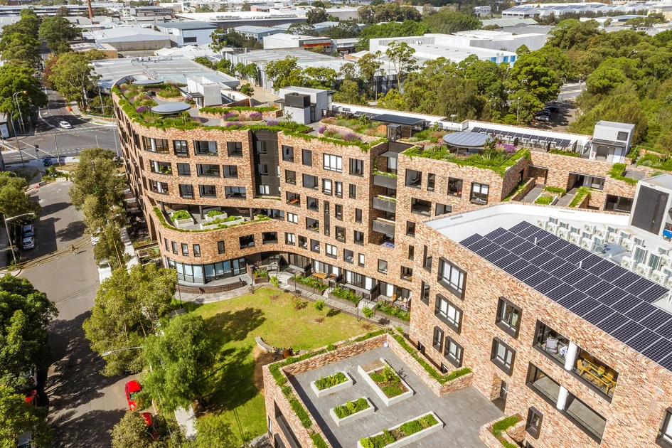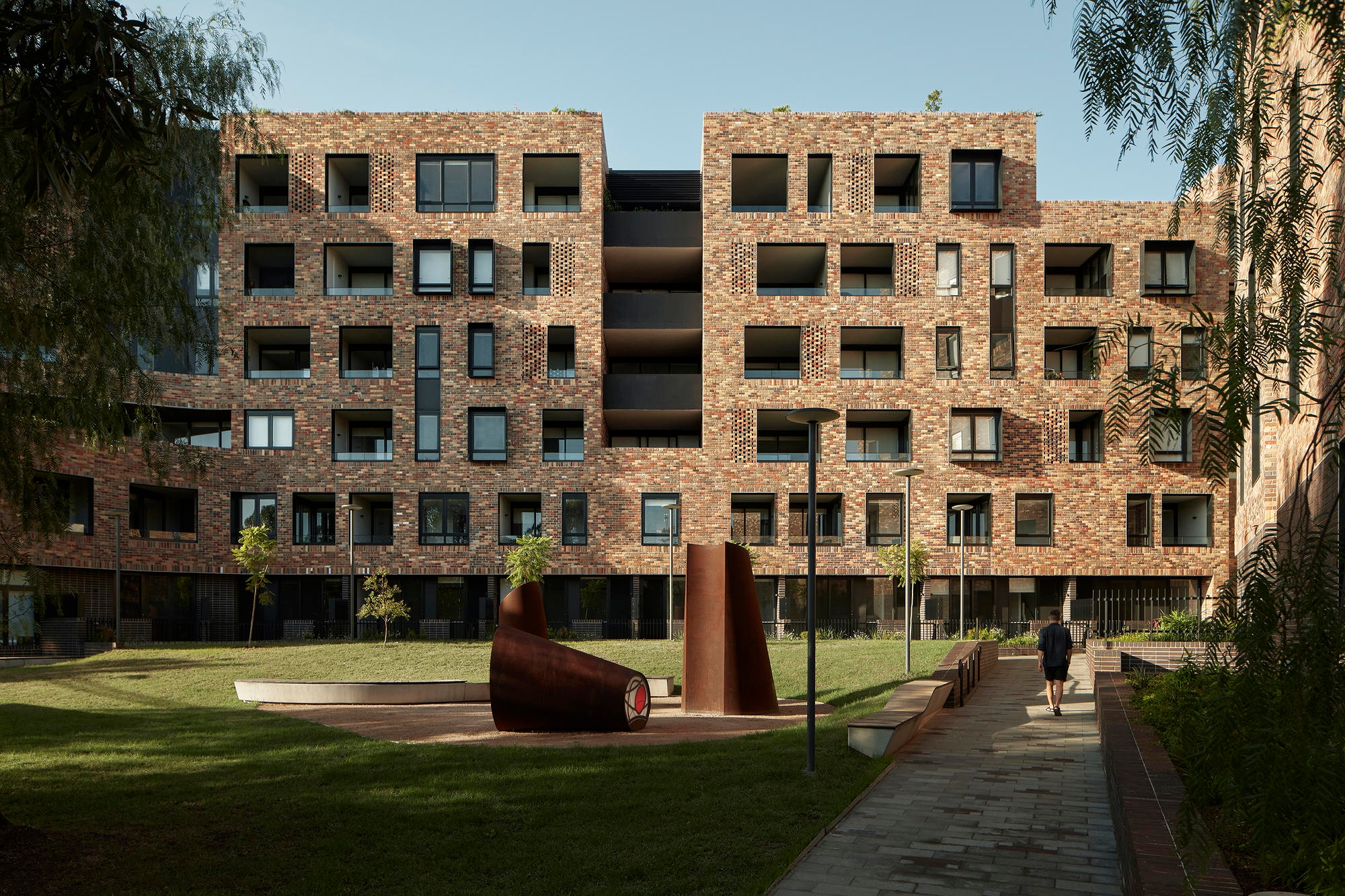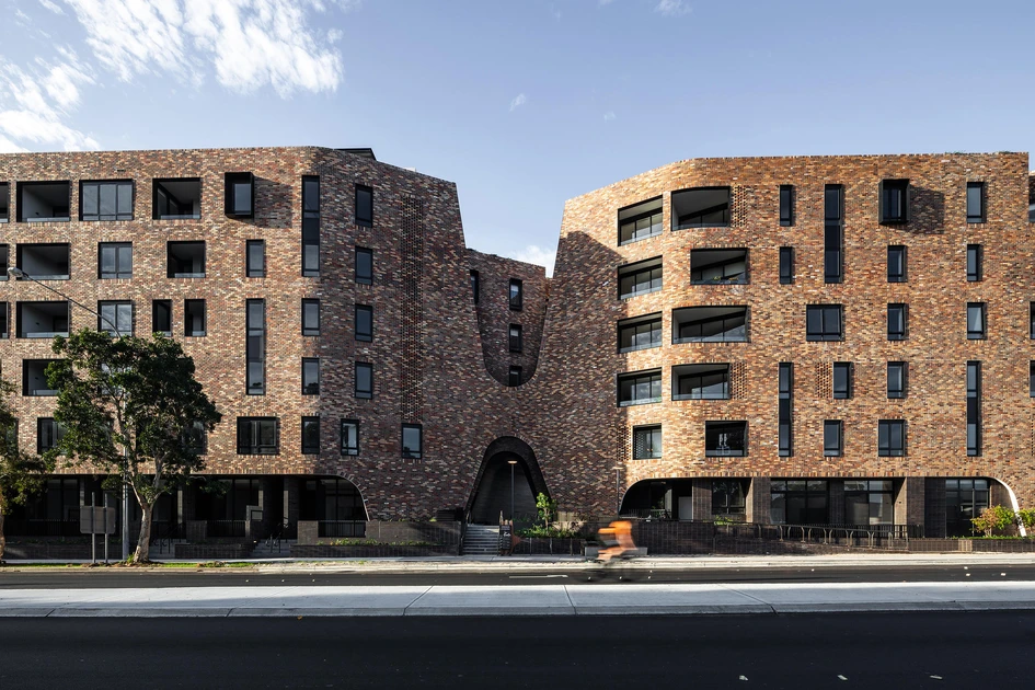In Sydney haben DKO Architecture und Breathe Architecture einen geschwungenen Wohnblock namens Arkadia fertiggestellt, dessen Gemeinschaftsbereiche im Erdgeschoss und auf dem Dach mit Grün bepflanzt sind. Braune, orangefarbene und honigfarbene Ziegel verweisen auf die Geschichte des Ortes, der einst als Fabrik der NSW Brickworks Company diente. Ein bogenförmiger Durchgang durch das Gebäude schafft Verbindungen innerhalb der Nachbarschaft, unterstreicht aber auch die gewundene Form von Arkadia.