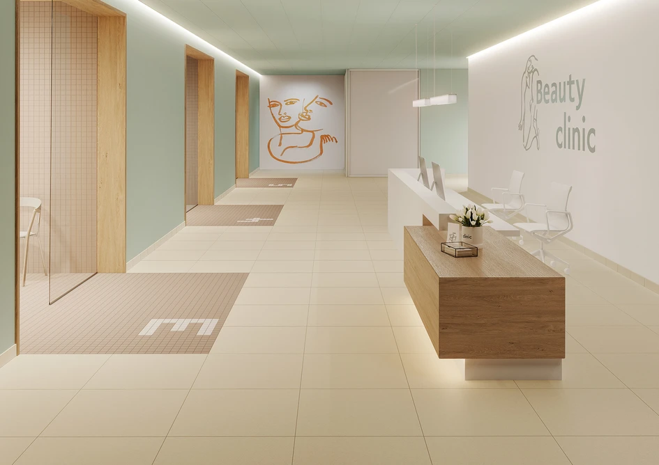 Reflective and matt surfaces can enhance the colour effects and strongly influence the perception of an interior. The choice of surface also depends on where the tiles are to be used. The stoneware surface CeramicPlus minimises the required cleaning effort, and VilbostonePlus is resistant to stains and dirt. Of course, the surface texture can also be functionally employed to make barefoot zones in the spa slip-proof or to minimise wear with coloured porcelain stoneware.