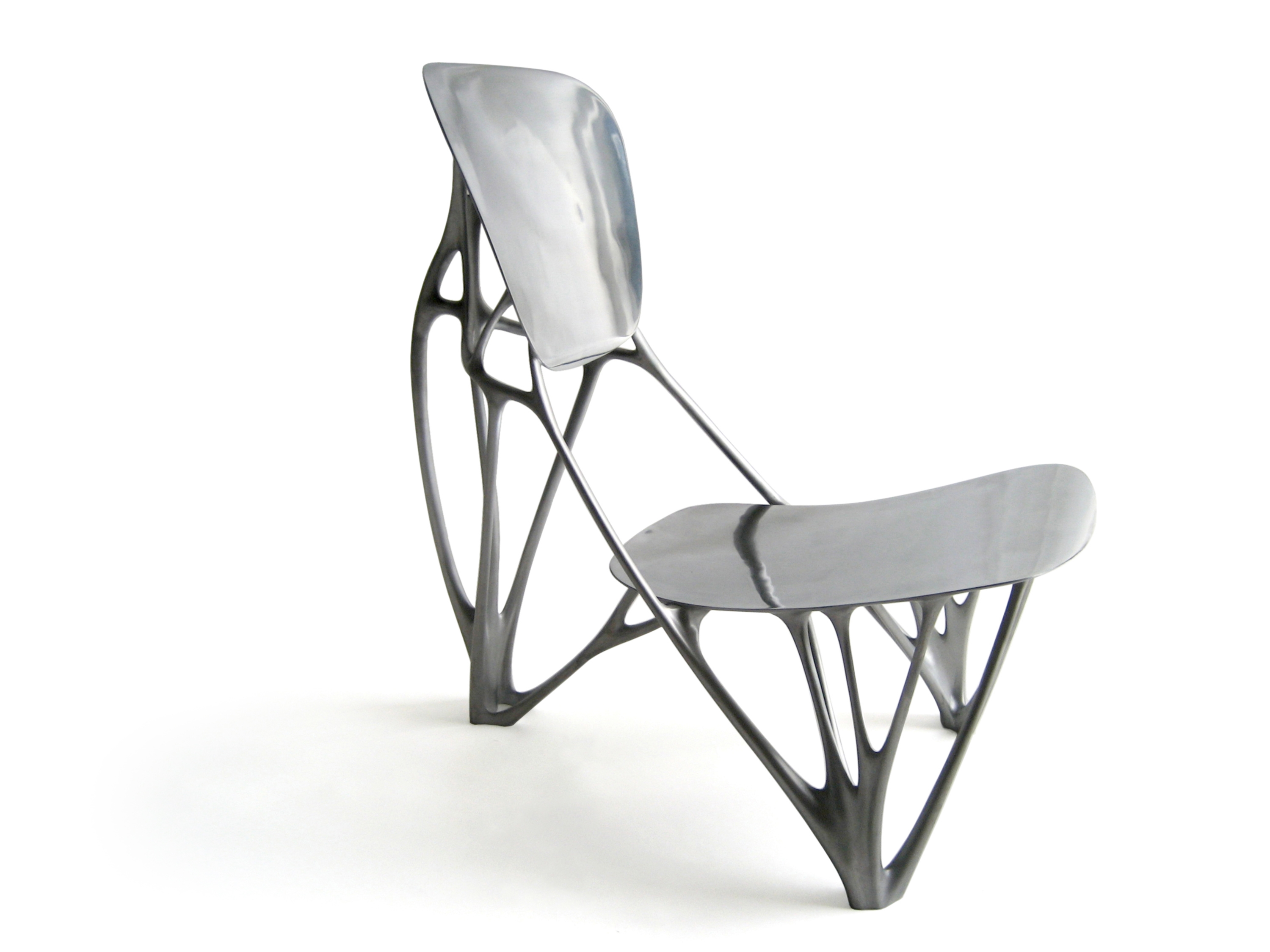 Neben "A.I." gibt es noch weitere experimentelle Möbelprojekte, für die Algorithmen zur Gestaltung genutzt wurden. Der niederländische Designer Joris Laarman entwarf beispielsweise einen Stuhl, dessen Form ebenfalls durch die Reduzierung von Gewicht und Material entstand. Bone Chair nennt sich sein Experiment von 2006, da der Algorithmus, ähnlich wie beim Knochenwachstum, nur dort Materie aufbaut, wo sie benötigt wird, um ein optimales Verhältnis zwischen Stärke und Gewicht zu erzeugen. Laarman sieht im Einsatz von Algorithmen aber nicht nur die Möglichkeit zur Optimierung eines Produkts, sondern auch das ästhetische Potential. Künstliche Intelligenz wird für ihn zum Formwerkzeug, das neue Möglichkeiten bietet, die über die bisherigen Grenzen der industriellen Produktion hinausreichen.