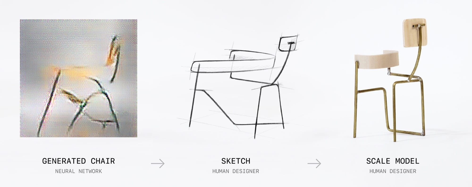 Mensch und Computer werden beim Einsatz von Künstlicher Intelligenz also zu Co-Kreateuren. Mit der Erforschung dieses kollaborativen Prozesses haben sich auch die beiden deutschen Designer Philipp Schmitt und Steffen Weiss befasst. Für ihr chair project fütterten sie einen Algorithmus mit mehreren hundert Bildern ikonischer Stühle des 20. Jahrhundert, um einen neuen Klassiker zu generieren. Die daraus generierten Bilder wurden von den Designern zunächst in Handskizzen und schliesslich in CAD-Modelle übersetzt, aus denen wiederum Prototypen entstanden. Die Serie umfasst vier handgefertigte Stühle, die noch immer an solche erinnern, jedoch teils nicht mehr die Funktion eines Stuhls erfüllen. Künstliche Intelligenz dient hier also nicht der maximalen Optimierung, sondern liefert dem Designer neue, unkonventionelle Anregungen für den kreativen Prozess.