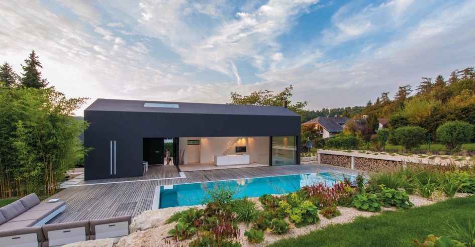 Consistency is key. The puristically designed concrete house, nestled in the landscape like a black monolith, has an interior done completely in white – from the floors to the ceilings to the furnishings. To avoid a colour clash, all of the flush-mounted switches and sockets in the house, from Busch-Jaeger’s luxury carat® series, were given a special white matt finish. The functions are centrally controlled by means of the Busch-ComfortPanel, within which reside the full spectrum of amenities of an infotainment and entertainment centre. The user can enjoy any and all of the options, in addition to light and temperature control, presence simulation and changing scenery.