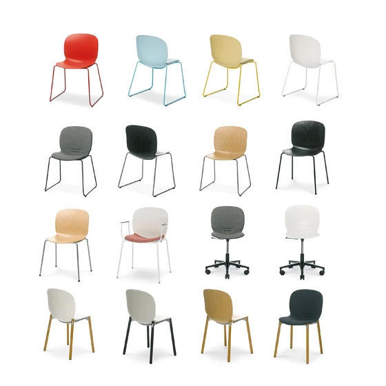 The round seat shell of the RBM Noor was developed on the basis of human body contours, with the surface adapting itself to the user. The polypropylene seats are available in five colours, and the 3D veneer in clear lacquered or dark stained oak. The chairs can be optionally ordered with upholstery. The tubular steel sled-type frames are available in different colours and with polished or powder-coated surface structures. The same applies to the armrests. The RBM Noor is available with legs in clear lacquered and dark stained ash-wood or a black, white or polished aluminium footbase.
