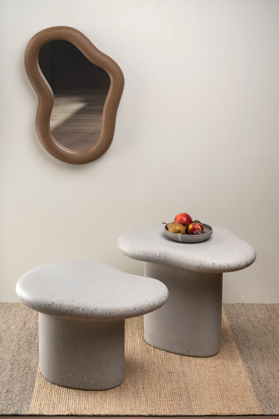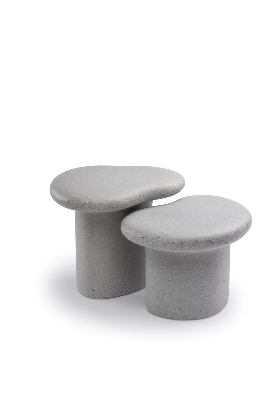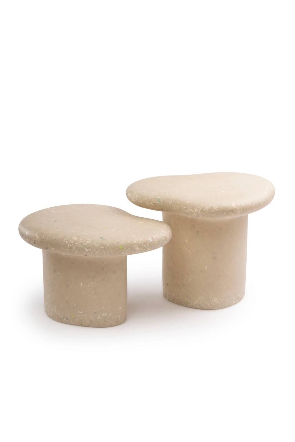 Coming in two heights that are alternately shaped, the pair can be nested together for a layered sculptural look. By spacing them apart, they can be styled individually. Whether placed beside a sofa, in a reading corner, or as sculptural pedestals, they bring playful character and tactile warmth to modern interiors.