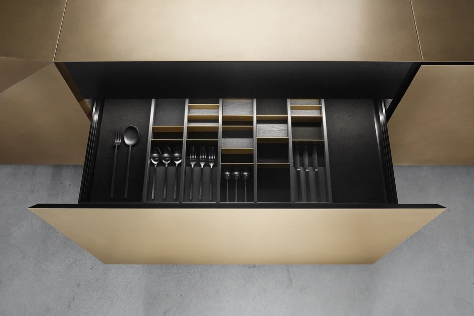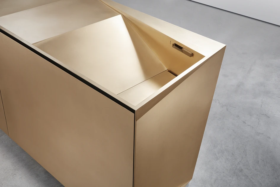 Whereas the kitchen was once used exclusively for the preparation of food, it now often forms the vibrant centre of our home and family life – a place of communicative interaction and shared enjoyment. The design of this gold-coloured focal point is not only beautifully styled, it is also highly functional and opens up surprising drawers and details on all its sides and in all its folds.