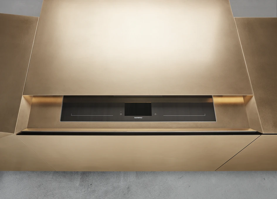 In the case of FOLD, form manages to perfectly conceal the kitchen’s technical refinements – a fact which raises the geometrical body, with its calm pose and bright, warm metallic look, well above its original purpose, transforming it into a sculptural object that would also be impressive in the foyer of a museum, in an event location or a prestigious hotel.