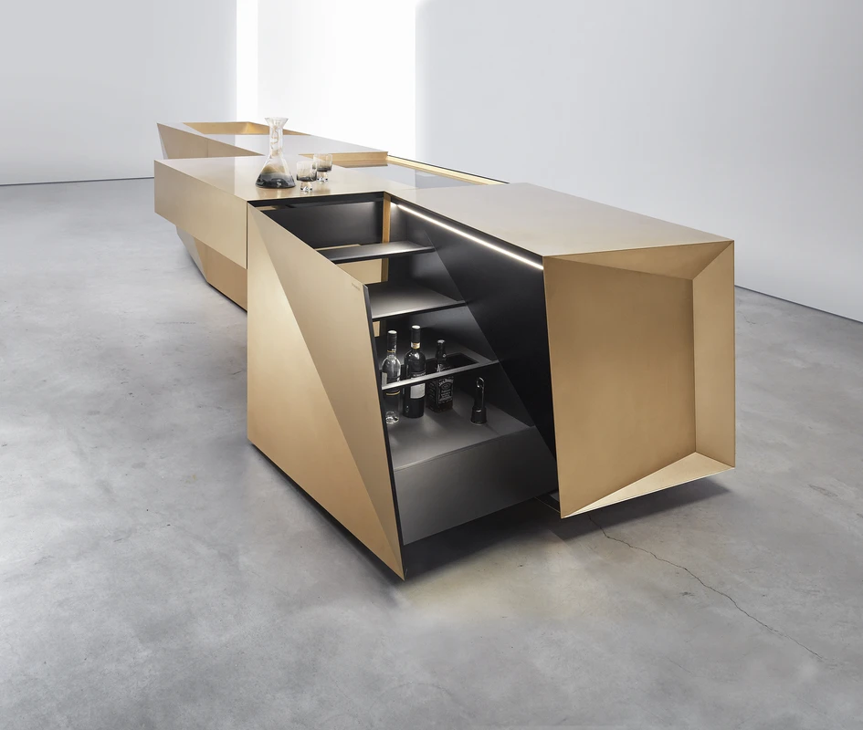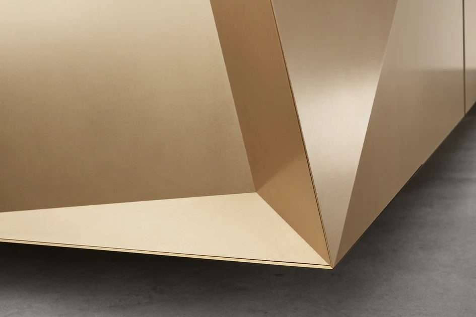 The FOLD kitchen by Austrian designer Martin Steininger gives the impression that one of these wishes has taken concrete shape in the form of a cubist statement that makes an impact not only because of its surface made of tombac, a high-quality brass alloy, but, above all, because of its purist elegance.