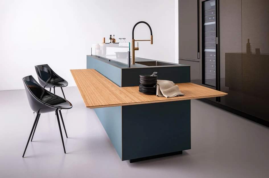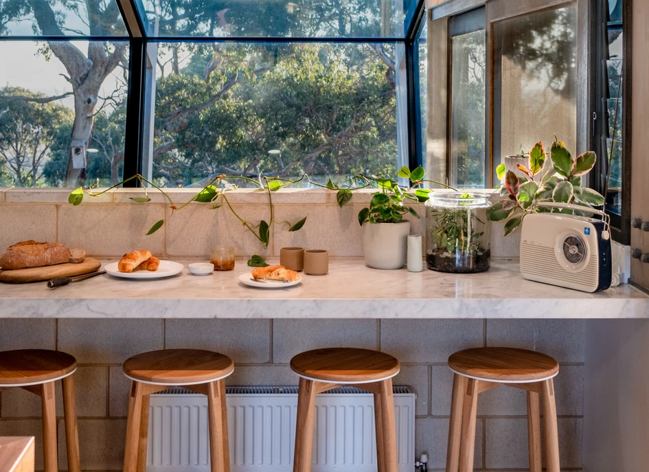 Kitchen islands with clear splits in height and material like Valcucine’s Artematica island allow breakfasting users to see those in the prep-space, while sitting at a comfortable table height. But if those seated for breakfast prefer to join the action of the living area, slim breakfast bars such as in the Bellarine Hillside House in Wallington, Australia, put the seats on the other side, looking out.