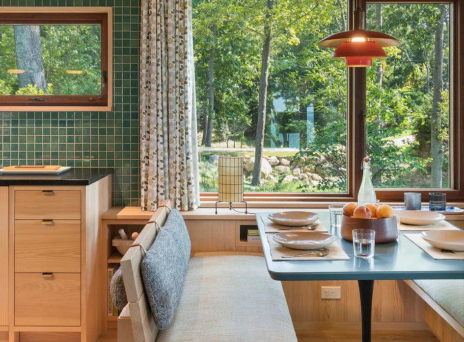 With a large footprint, the East End House in Long Island in New York State, US, has plenty of space for both a kitchen island and a small kitchen table, and a few more tables besides. With five separate seated dining spaces, hungry vacationers have their pick in the holiday home, each of them set alongside a glazed view of woodland or sandy beach.With five separate seated dining spaces, hungry vacationers have their pick in the holiday home