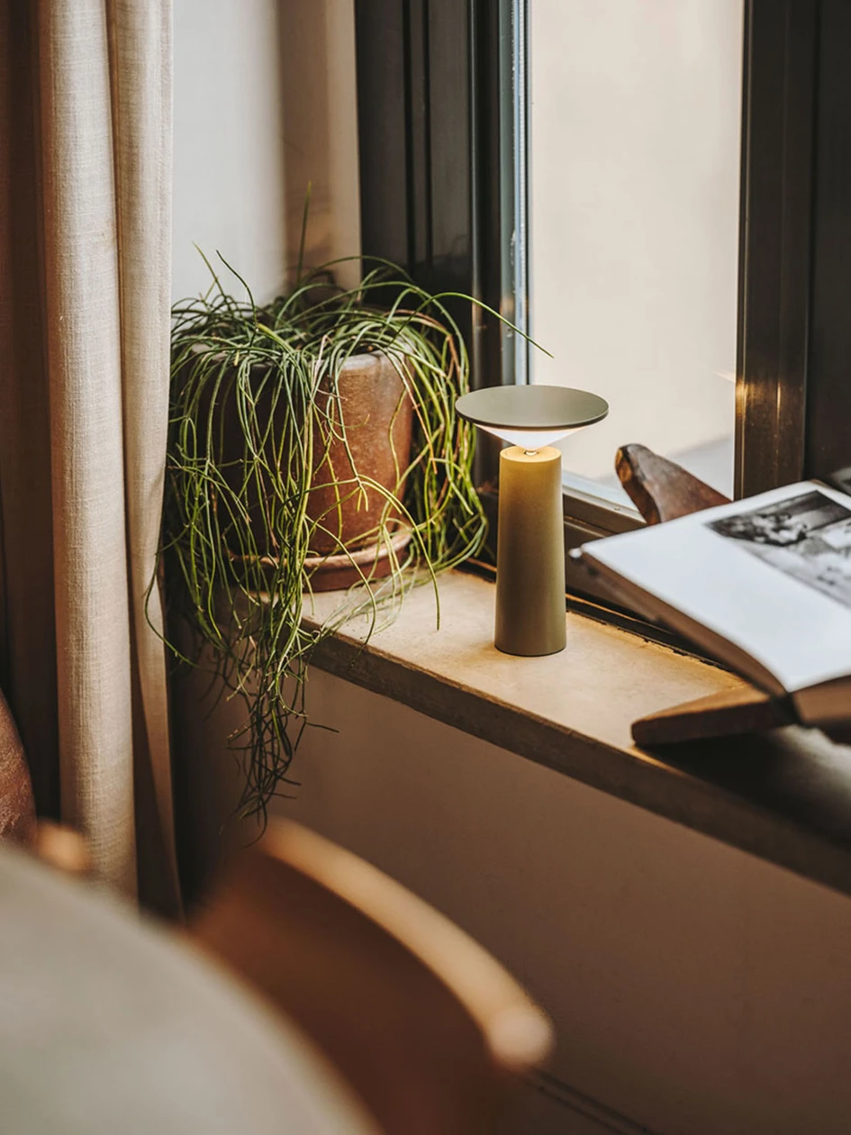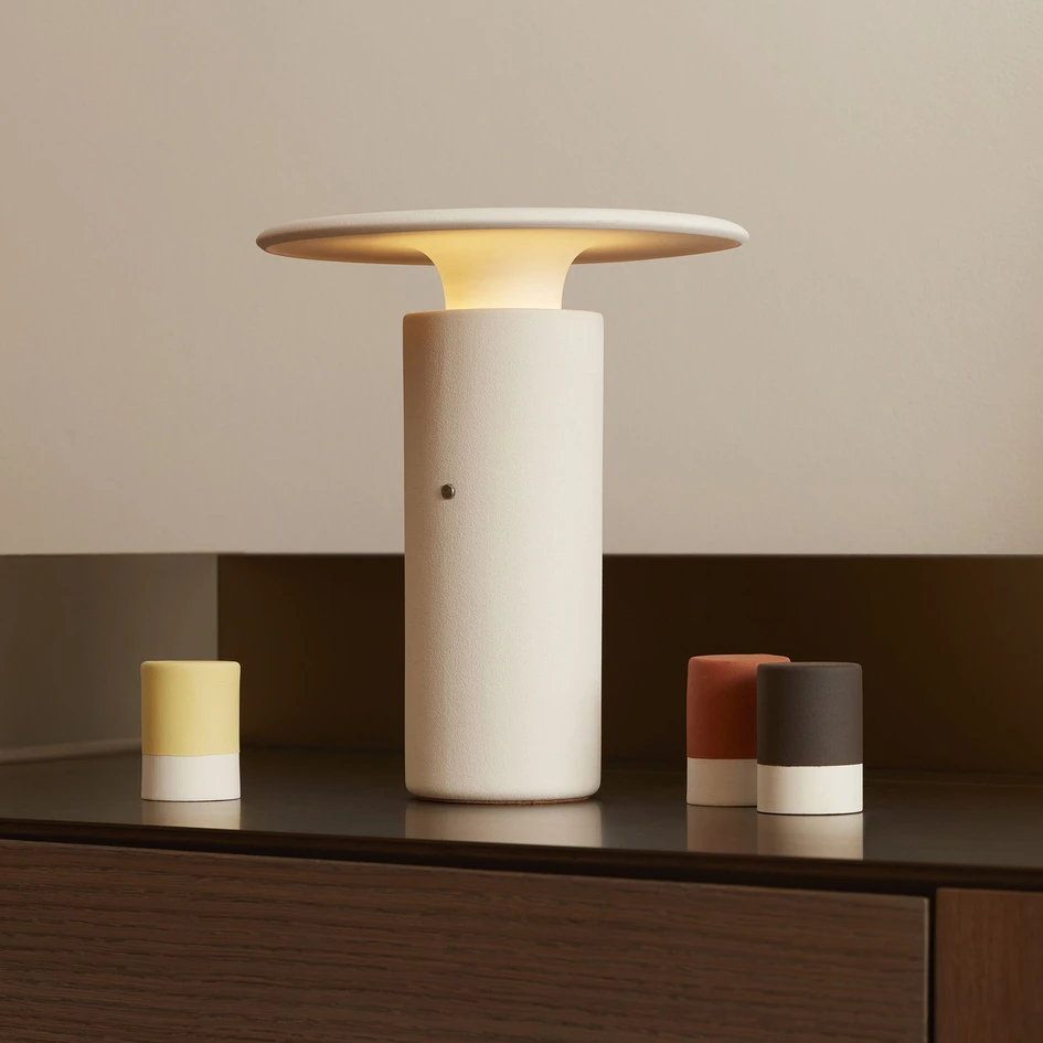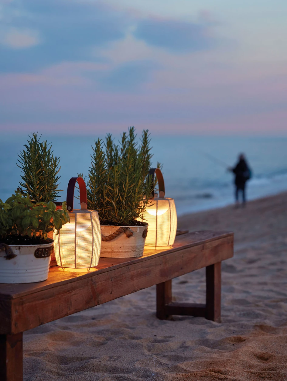 The Nais lamp by Luis Eslava Studio for Pottery Project from Spain is similarly puristic. The lamp body is made of ceramic. Also portable, its light shines both below the lampshade and from its funnel-shaped top. Outdoor lantern Tanit by Gonzalo Milà for Bover also comes from Spain. The shade consists of carefully wound cotton cords and ensures that the light gently illuminates the darkness of the night, while Its handle is suggestive of nighttime walks on the beach.