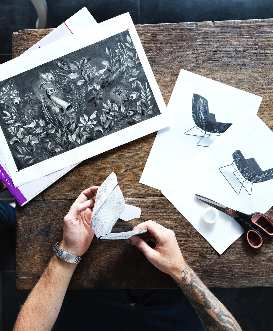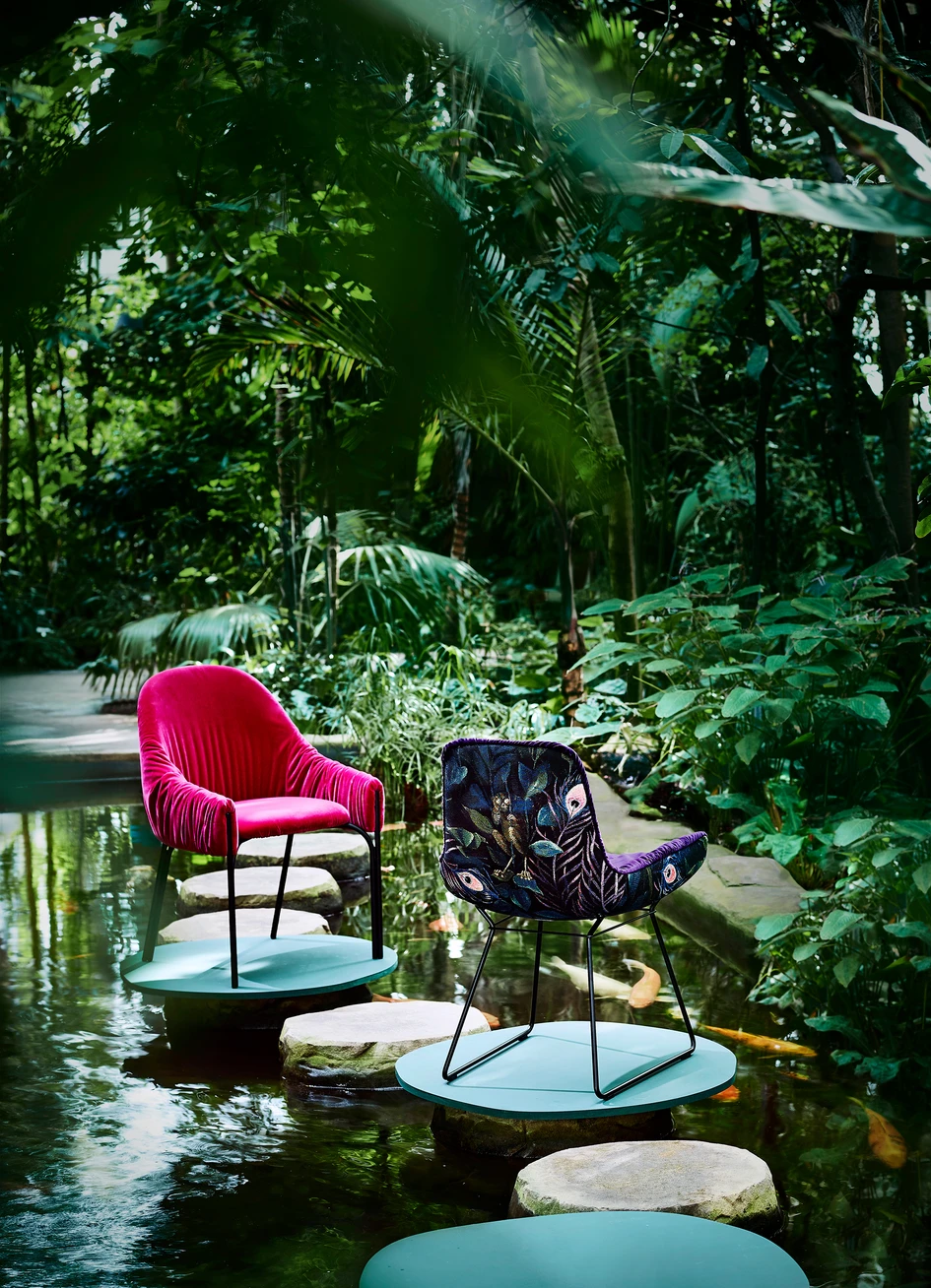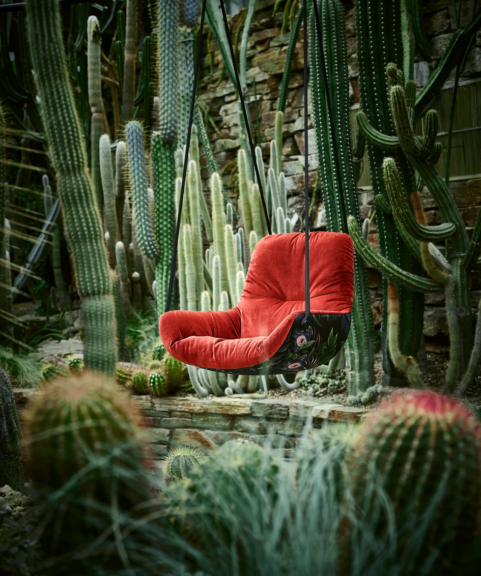 Upholstered in the artfully designed ‘Oasis-Gobelin’ fabric, it takes on what could be described as paradisiacal traits – with the shapes and colours of a fairytale-like forest where plants entwine, goblins hide and a peacock presents its striking plumage. Together with Belgian company Meisterwerke and the tattoo artist Christian Trzaska, Lemgo-based FREIFRAU has created a velvety upholstery fabric for the Swing Seat that both stimulates the imagination and transports one to other worlds.