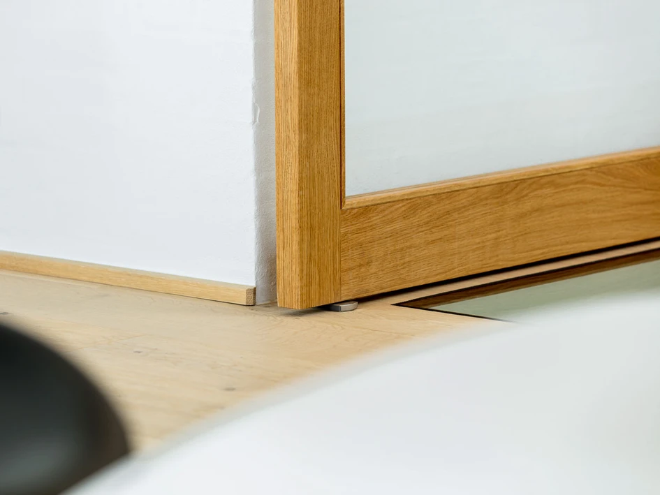 Execution is just as effortless. The system’s straight-forward installation requires little on-site labour and takes just 30 minutes. installing the floor plate, the ceiling plate, and the door is done when the final floor is in place. Thanks to the floor plate’s short pins, underfloor heating is not an issue, and they can be installed in new and existing interiors without the need for excavation of the floor.