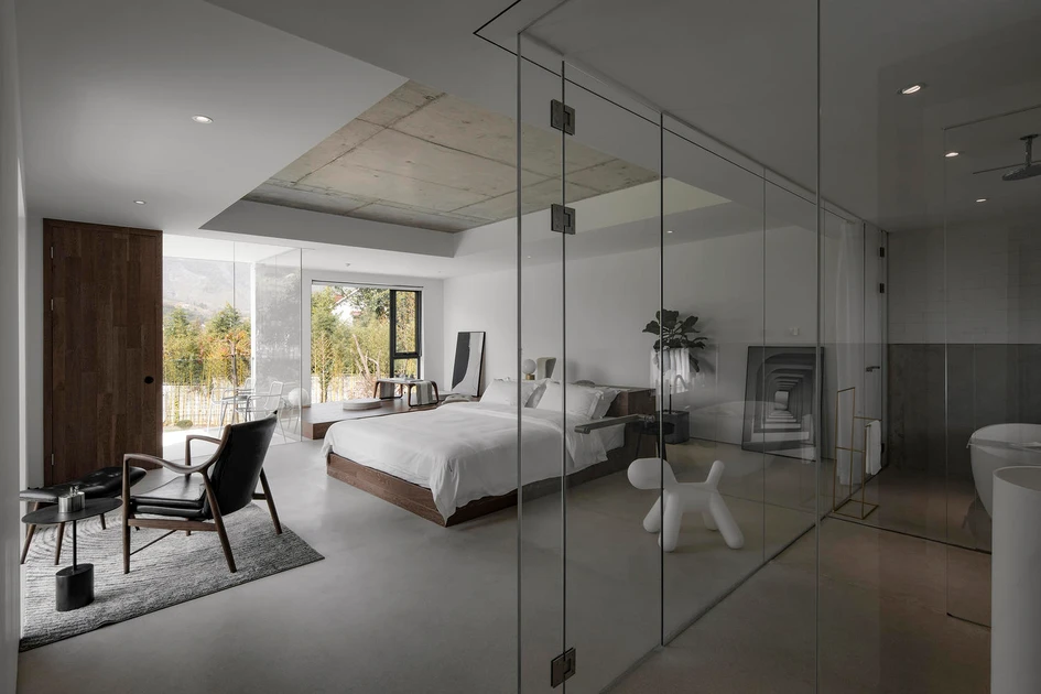 Outside the city of Hangzhou in eastern China, Atelier Right Hub designed Mymory – Boutique Hotel. Comprising a traditional rural house and a tower-like modern, concrete structure next to it, the hotel contains large suites with glazed partitions separating bathrooms and offering views of the interiors and the landscapes beyond. With large glazed surfaces, dramatically carved voids, and a reflective exterior, the baths with a view are just one element of this stylish and visually captivating hotel complex.