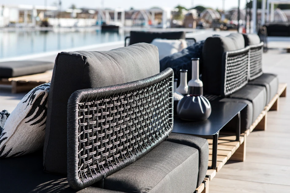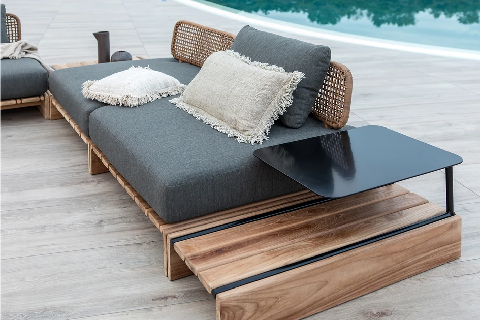 Casual Modular is a furnishing system made to withstand the elements, but equally at home, in lobbies and in holiday villas as well as poolsides. It is almost entirely designed around a teak base in various sizes and shapes. When a cushion is added it can become a pouff, a bench or a section of a sofa. If a tray is added it becomes a coffee table, or alone it is also a table, filling gaps between seating with a handy ledge. Woven back rests can be inserted to give more structure where needed too.'The various elements can be positioned anywhere in the space to be furnished with the possibility of countless combinations,' says Basso. 'The limit of combinations is only the imagination.' Designed for 360 viewing, the various elements can be used like building blocks to form room sets which can easily be broken down and reconfigured, should there be a call for change. It fits in well with the recent evolution of ‘outdoor rooms’, providing not only the furnishings but the walls too.