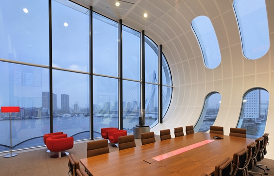The penthouse contains the headquarters of a real estate developer and most of the two-storey interior functions as flexible office space, with a double height boardroom and four smaller meeting rooms occupying the northeast corner. Internal walls and ceilings are clad in the same material used for the building’s exterior, with wood, ceramic and stone softening the aesthetic. The prefabricated penthouse adds an additional ten percent to the renovated building’s volume, but more importantly its gleaming parasitic presence acts as a beacon for this docklands development.