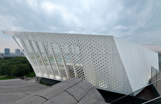 The main building now houses 25,000 square metres of multifunctional space, including the Dutch Museum of Photography, but it is the spaceship-like extension that seems to hover above its rooftop that attracts most people’s attention. It sits on 23 steel support columns that had to be carefully positioned around the existing chimneys, beams, windows and staircases on the building’s roof and is built from lightweight materials – including hollow-core concrete floor slabs – to minimise additional load on the overall foundations.