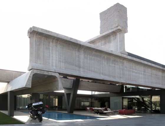When Spanish architect Antón García- Abril of Ensamble Studio decided to build a house for himself and his family on the outskirts of Madrid, he chose to showcase the structural potential of prefabricated concrete beams with a design that balances 230 tonnes of concrete and a steel frame in a seemingly unstable arrangement. Three massive I-beams form a helical foundation upon which the other sections are balanced and a twenty tonne chunk of granite perched atop the uppermost beam acts as a counterbalance for the entire structure.
