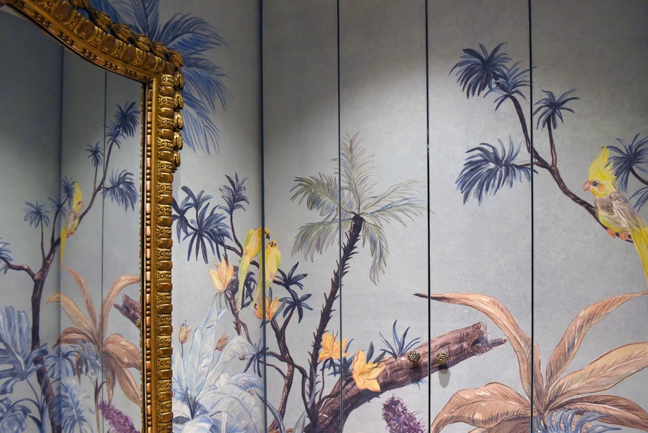 For a home in Hamburg, interior designer Julia Korzilius picked the extravagantly tropical-themed wallpaper, Polly, picturing a jungle scene of luxuriant blooms and yellow cockatoos that seamlessly lines an entire hallway, including a built-in wardrobe.