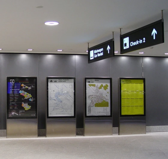 Having proved its effectiveness, the innovative folding frame on the airport display panels (which can be snapped open and shut easily) was optimised for the Messe Basel wayfinding system, where flexibility was key. A trade-fair venue has to respond to the differing needs of its various organiser clients, which means changing layouts and circulations, and varying levels of information for visitors with regard to location and orientation. Quick turnaround is vital.