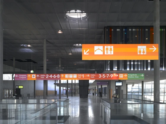 Not all wayfinding projects plough a restrained furrow, however. In contrast to Messe Basel, design studio büro uebele’s signage and directional programme for Messe Stuttgart uses colour as a key means of orientation for fair-goers. A strong palette of hues communicate, in turn, the way to the halls, the congress centre, the press centre and the outdoor fair.