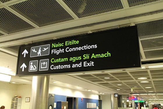 A more judicious use of colour, meanwhile, but nonetheless a potent one, can be found in Dublin Airport’s information and directional signage programme for the second terminal, which opened at the end of 2010. Here, as at Zurich Airport, the graphic language is controlled, yet the bilingual nature of the signs sees the introduction of a sharp green to the otherwise monochromatic treatment, as means of differentiating the two languages. There is more at work here than bald functionality, however. No prizes for guessing that it is the Irish type (which sits above the English) that is picked out in green; wayfinding operates here as both utilitarian mechanism for moving passengers through the airport space, and as expression of national identity.