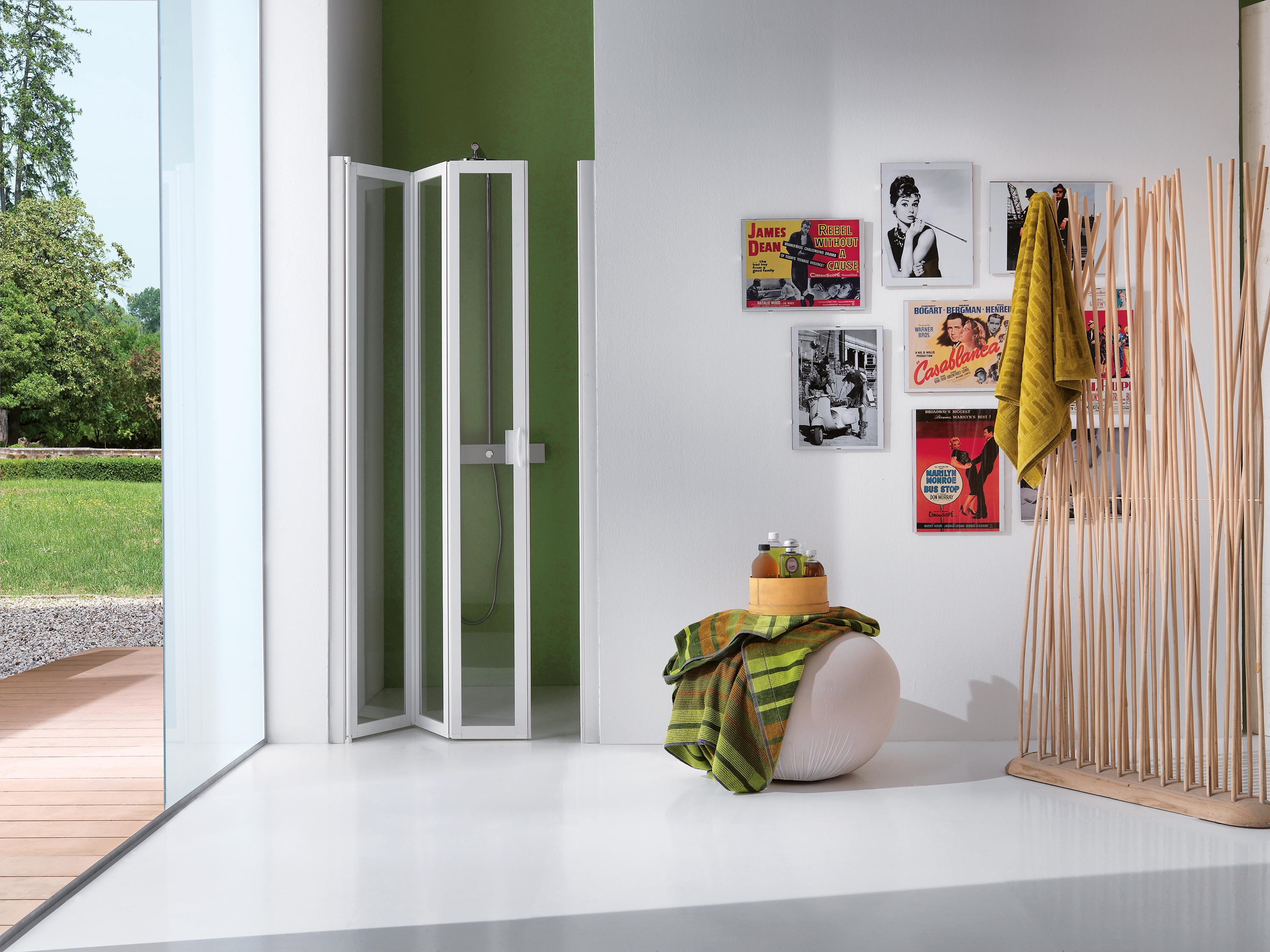 The sanitary space’s multifunctionality and schedule of peak and off-peak use mean privacy within the shower enclosure is essential