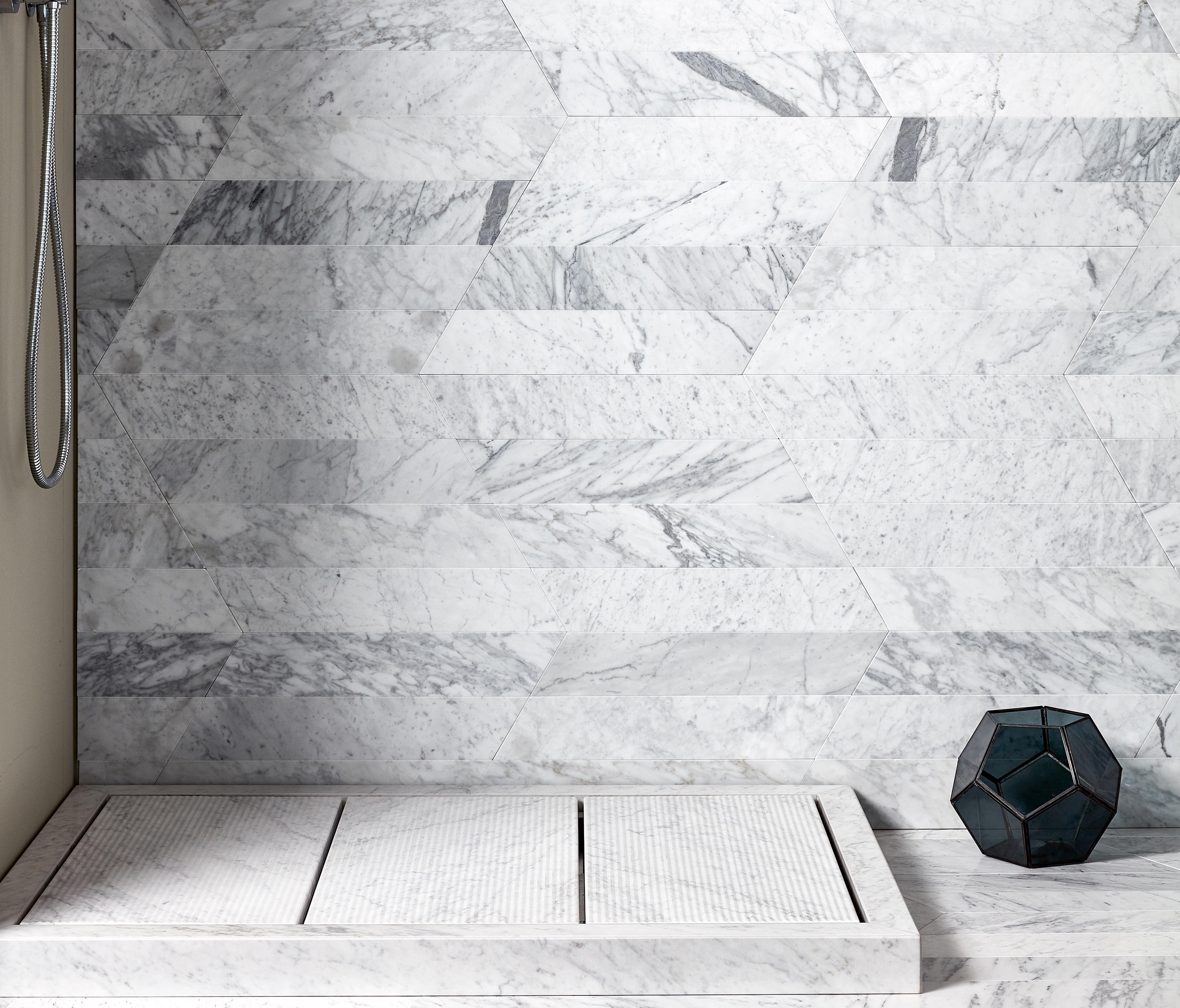 Using frosted glass as an aesthetic opportunity, Glas Marte’s textured ICE-H panel features a pattern of forming ice crystals. And even without a door to frost, a cornering labyrinthine shower enclosure brings the ease and luxury of a walk-in to introverts, too.