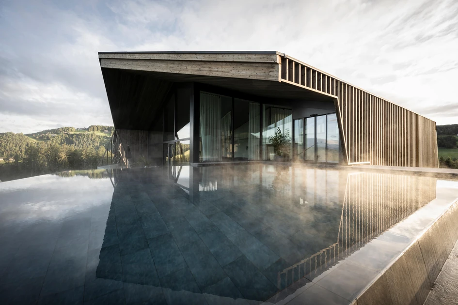 From keeping them low, to raising them up: the Hotel Hubertus takes the infinity pool to new heights. Up to 12 metres high to be exact. Supported by large larch logs, the 12-metre drop can be seen from inside the pool itself, with a portion of the 17-metre-long stone base replaced with toughened glass to give swimmers the feeling of floating amongst the clouds.