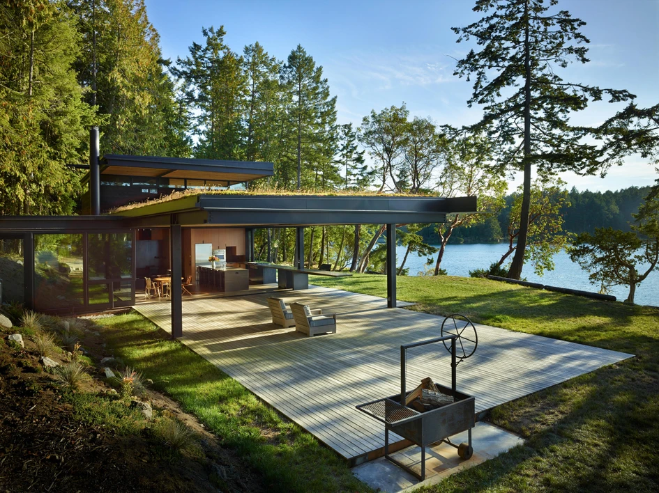 Not all balconies need to provide extra living space, however, this one is used to replace it. The family at Pole Pass Retreat on Orcas Island, USA, wanted a large portion of the site’s footprint to be dedicated to a ground-level terrace, making the surrounding grass and lake instantly accessible.