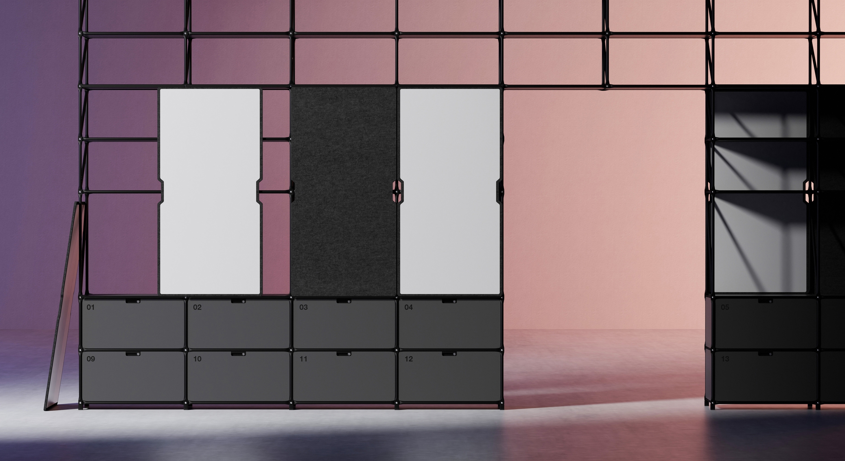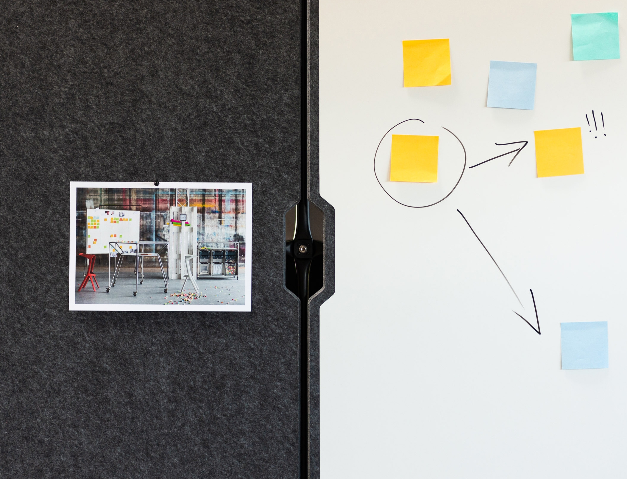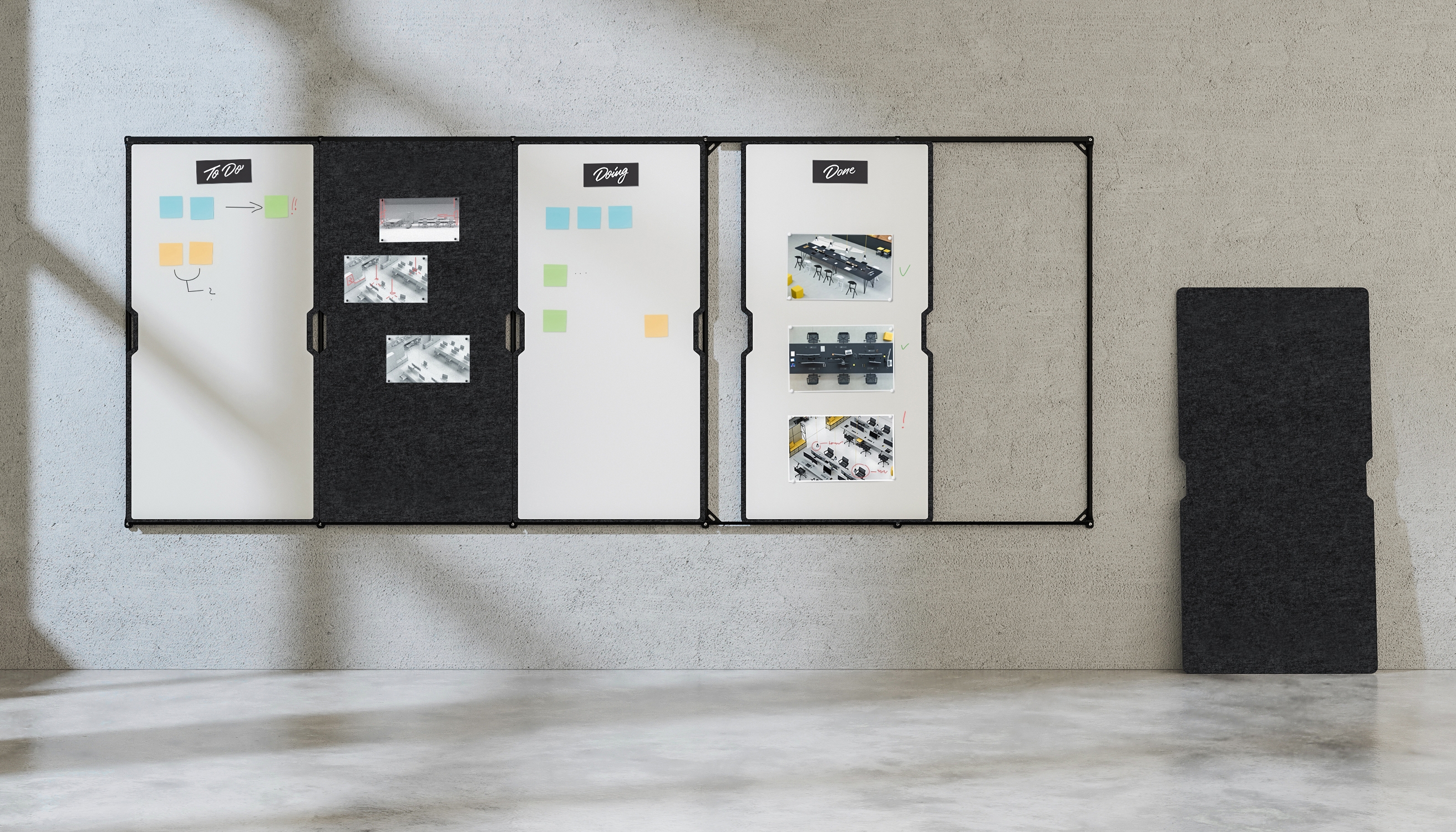 Apart from the prerequisite that FlexBoard Pro be compatible with System 180’s 90-centimetre module grid, it was vital the product be of a high quality materially. The team’s research (governed by an optimal price-service ratio) identified ceramic steel as the best contender for the whiteboard, as it’s scratch-resistant and comes with a 25-year manufacturer warranty. The light-fibreboard side, meanwhile, includes recycled plastic compounds.