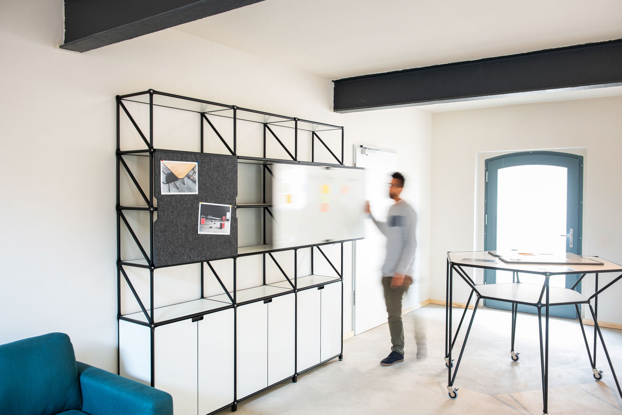 Central also to the FlexBoard Pro design brief was the requirement that no retro-engineering be necessary. So, the team set about developing a new mounting mechanism – called FlexRail – that could be applied directly to an existing shelving system, and, of course, removed at any time. The result are super-slidable boards for speedy reconfiguration by working teams.