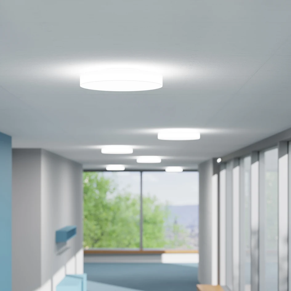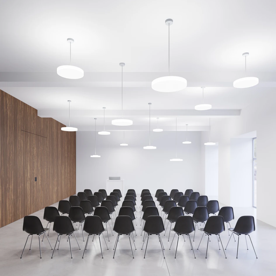 Its potential applications are many, but Milano Slim shows its advantages particularly in relation to office and classroom lighting. The cylindrical shape provides homogeneous, 360-degree illumination, which allows the light to shine directly, indirectly or sideways without shadows. Milano Slim thus creates a uniform, pleasant ambient atmosphere, whether in a canteen, break room, corridor or another intermediate area.