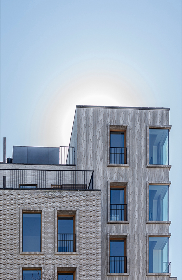 In general, the overall expression and finish of the brickwork is inspired by the many towers on the boulevard. So are the windows. The size and position in each of the 30 apartments of the project imitate its neighbouring buildings.