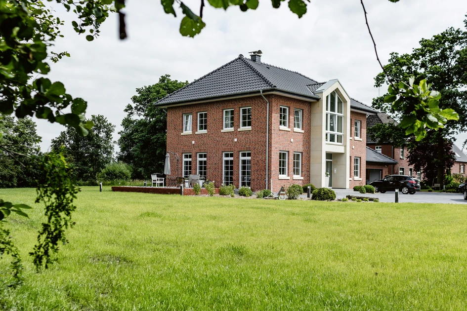 At the end of the avenue, the new red brick building with its extravagant central facade made of sandstone integrates itself perfectly into the landscape. Already the entrance bids the visitors a warm welcome. On the left the white blossoms of the Hortensia and on the right the white Busch-Welcome® outdoor video station for door communication. This already gives the impression that you are standing in front of a smart home.