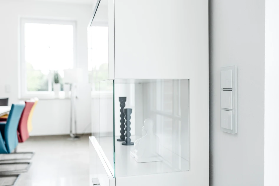 Both switch ranges Busch-axcent® (on the ground floor) and Busch-balance® SI (on the top floor) are installed in the house. Especially on the ground floor do blind and push-button switches, socket-outlets and SCHUKO® USB socket outlets catch the eye due to the glass frame. The Busch-axcent® range also impresses with its lively and consistent design as well as the puristic, elegant optics.