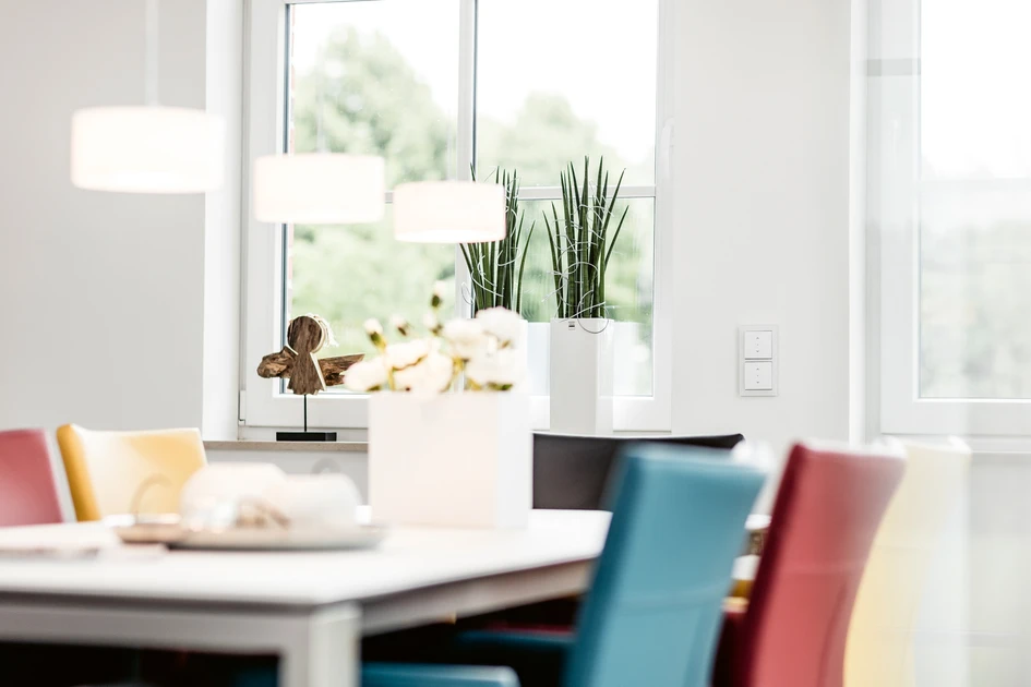 The room temperature controller with its actual value display provides additional comfort and energy efficiency. The temperature can be set precisely with the rotary control element. The viewing window always displays the current temperature in the room. Heating to meet the requirements is the key to energy saving because one degree less saves around six percent of heating energy. An excellent side effect when the stylish combination of living and dining room with the four terrace doors is still comfortably heated.