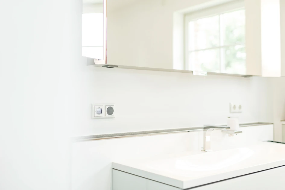 Access from the corridor to the upper floor of the 220-square-metres large family house is gained via a white staircase made of natural wood. Busch-iceLight® shows the way. The innovative LED lighting system has been specially developed for the energy-efficient illumination of rooms. Once you arrive at the top, you find three bedrooms and a large bathroom. In the modern bathrooms, and on the top and ground floors, the Busch-RadioDigital system with its built-in loudspeakers cares for entertainment. Also, the radio goes on directly when the light is switched on.