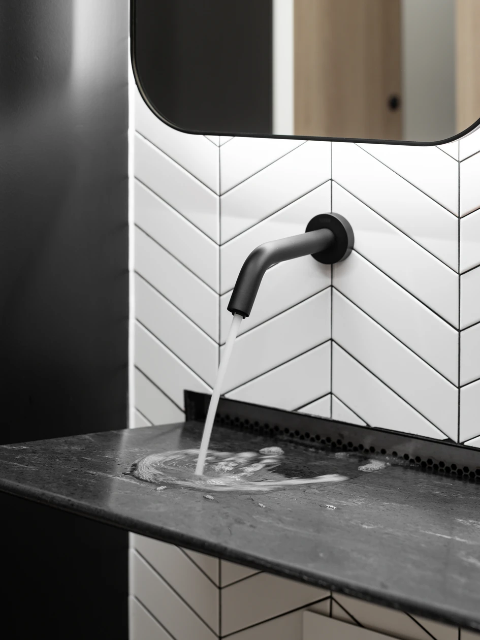 Take the Aerofoil basin, a highly technical design feat, which floats on a wall like a falling shard. In a black marble-like finish, it proved the perfect piece to elevate the washrooms of One Saint Paul’s Square, Liverpool, to match the lofty functionality and aesthetic goals set in the lobby and common areas by architects GPAD. The collaboration with chevron tiles and oak finish panels ensures a cohesive experience as you travel through the space.