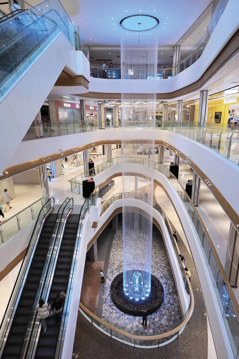Indoors, too, this creative use of water provides real enrichment. In the Xinhu Mingzhu shopping centre in China's Suzhou City, for example, a fascinating interplay of crystal-clear drops has been installed to accompany the shopping experience in a unique way. An impressive round curtain of water, over 26 metres high, forms the central eye-catcher of the inner courtyard and consists of 578 almost invisible Mylar threads, along which drops of water run in a simulation of falling rain. The project has attracted worldwide attention and earned Oase another entry in the Guinness Book of Records.