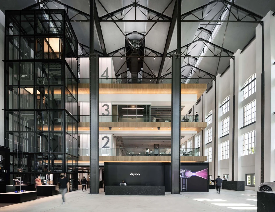 ‘The former Turbine Hall is a dramatic four-storey industrial space at the heart of the building’s design. The central space serves as a circulation hub, connecting all areas. An inner retreat for agile working and a community space for people to meet and connect, the hall’s feature spiral staircase links all four floors and supports the connection between departments.’