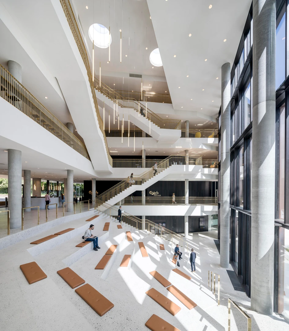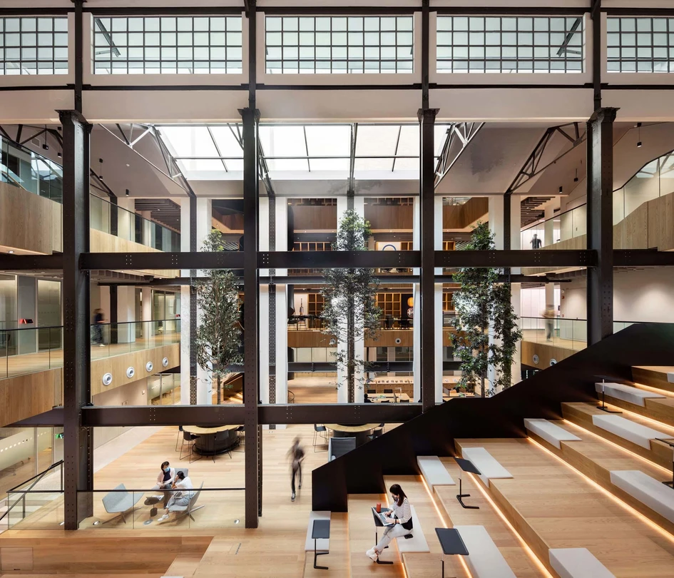 Used to visually and audibly connect floors and departments across expansive office buildings, these light and open gathering spaces use skylights, glass walls and partitions, open balconies, interior street furniture, biophilic design and acoustic surfaces to keep employees calm and connected while at work. With workers' mental health and wellbeing now a crucial factor in office design, these calming spaces add a breath of fresh air – sometimes literally – to corporate environments.