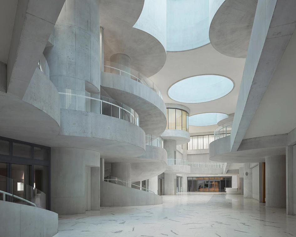 'The open atrium of the main building can be experienced vertically as an urban forum. The result is a multifunctional space with a campus character. Functioning as a hub, with branches winding through all seven floors like a spiral, the atrium creates a variety of visual relationships around a clearly defined centre.’
