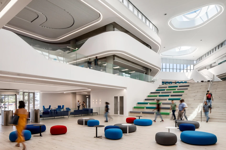 ‘The three-storey superstructure wraps around itself, which creates a unique ‘doughnut’ shape and forms a central triple-volume atrium – an internal ‘social spine’ at the heart of the building. The open floor plan that loops around the atrium’s periphery is connected by a series of dramatic bridges and staircases, interconnecting the various departments and creating opportunities for chance collaborative encounters and personal interactions.’
