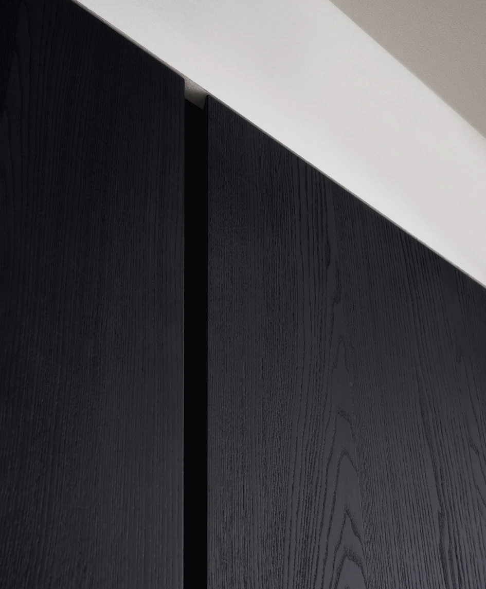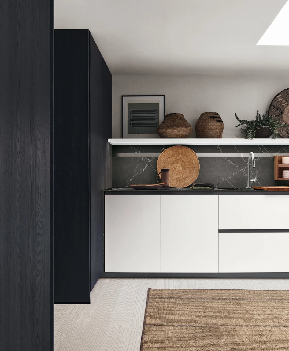 Thea’s more technical innovation is the development of a new Gola Profile, the handleless opening systems built into kitchen cabinetry to eliminate interruptions to spankingly clean lines. Thea’s continuous Gola Profile works horizontally, to open cupboards and drawers below the countertop, and also vertically, in the tall cabinetry used as partitions between the zones.