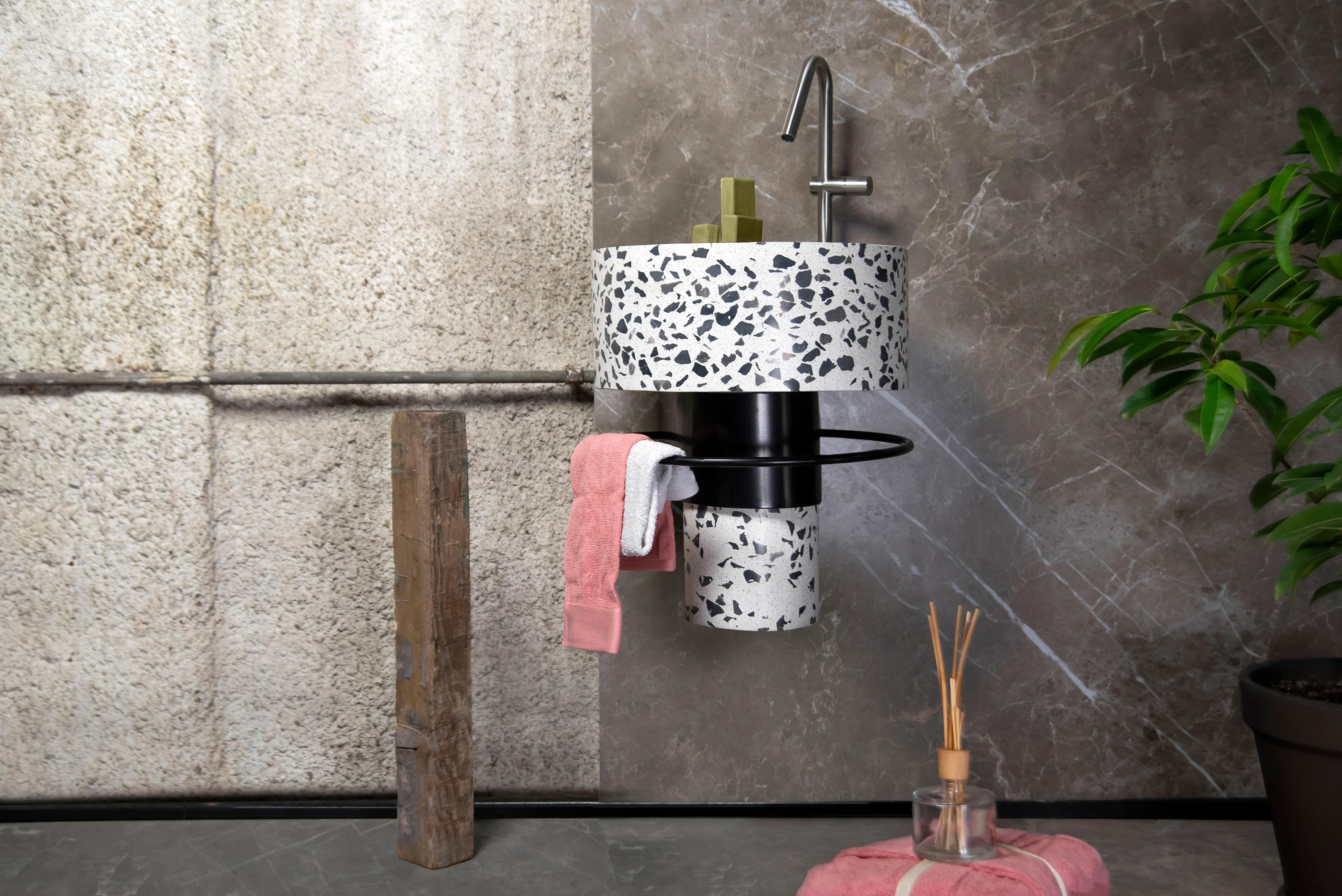 These functional, customisable and decorative features of terrazzo make it a useful material for designers to specify for interiors, but the same features also make it a popular material for product designers, too. The long-lasting durability of waterproof terrazzo, combined with the monotone aesthetic that’s possible with the mosaic-like pattern, make Urbi et Orbi’s wall-hung Balcony washstand a possibility. And Mambo Unlimited Ideas make extremely good use of terrazzo’s ability to tie colour palettes together, combining the dark blues and blacks of its lighting pendants’ steel structure with the warm yellow hue of its rattan pattern and the soft white of the light itself, all with an accompanying geometric piece of terrazzo.