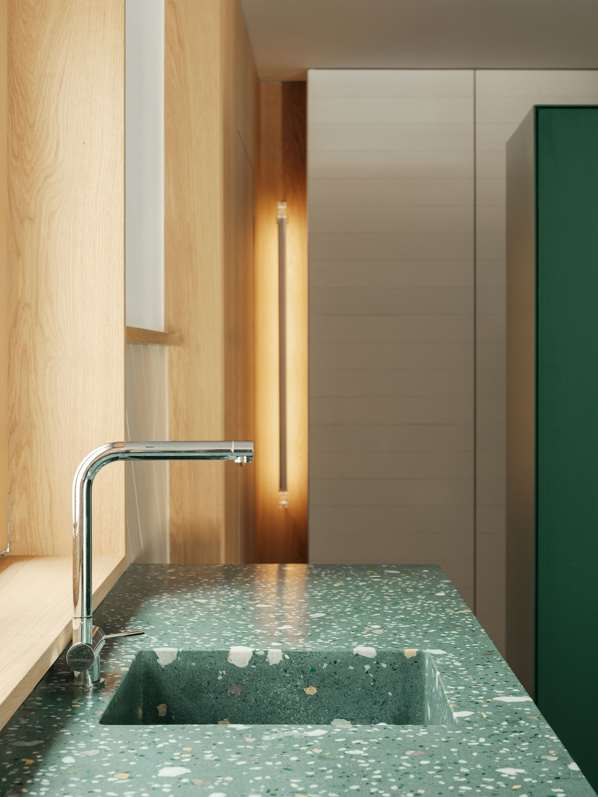 Due to its durability, combined with a smooth, crack-free formation, terrazzo is a highly functional and ultra-hygienic surface solution for kitchen worktops as in the two projects above, but the ability to be poured into a mould means the material also has a sculptural quality that’s perfect for integrated kitchen sinks too, such as in the First House by HANGHAR.