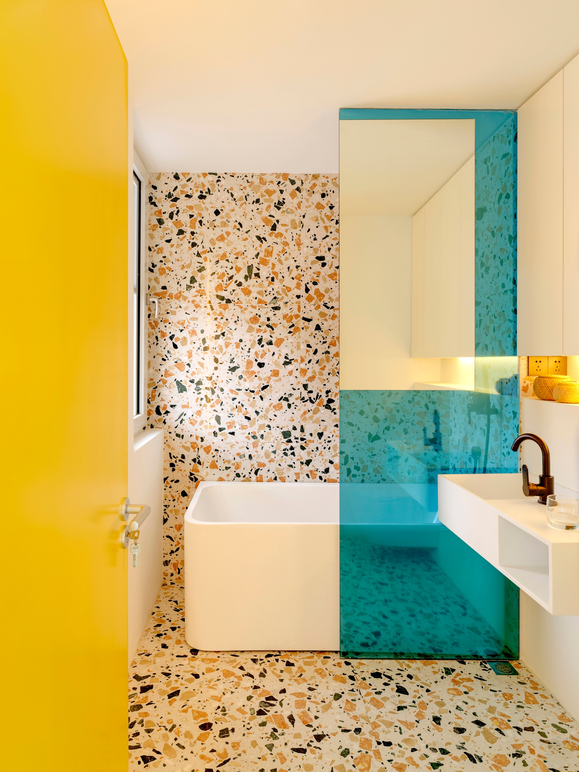 Due to the opportunity for customisation in the shape, size and especially the colour of its constituent parts, the terrazzo pattern is one that deserves to get noticed on surfaces all over interiors, not just down on the floor. Yellow and turquoise emerge from the terrazzo surfaces in the kitchen and bathroom of House P, by MDDM Studio, for example, to echo the colour accents around the home. And even in spaces where a more subtle, reserved palette is in place like the pastel blue and natural wood at the Ne-On Apartment by NestSpace Design, terrazzo surfaces can tie them all together.Yellow and turquoise emerge from House P’s terrazzo surfaces to echo the colour accents around the home