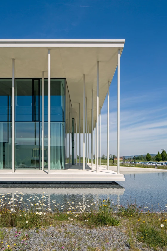 In business since 1896, award-winning bathroom brand talsee has made it its business from the start to Do Things Right. Anyone arriving at its flagship showroom in the small Swiss town of Hochdorf, near Lucerne, understands this immediately. Adjoining the company’s streamlined manufacturing facility, the double-height, landmark building – designed by Burkard Meyer Architects, with creative input from talsee CEO Bruno Scherer – functions not only as an impressive space for staging talsee’s innovative range of value-added, architecturally led bathroom products (with offices and other administrative rooms off the first-floor gallery), it also serves, with its archly cantilevered roof and colonnading, as an emphatic statement. This is architecture as branding.