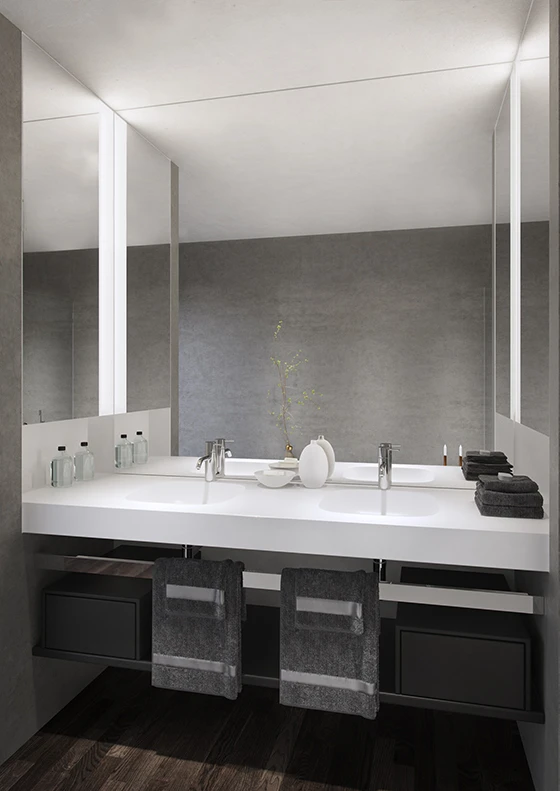 The precision craftsmanship of the pared-down forms made, says Aebi, for a series of bathroom spaces that communicate value and elegance. The generous double-washbasins, whose surface extends both left and right into wall niches, paired with full-height, built-in mirrors (replete with dimmable lighting and concealed storage) testify to this.